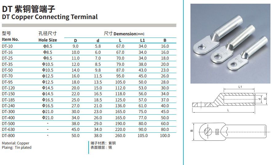 DT Copper Connecting Terminal: Combines the reliability of tubular crimping with the device connection function of a terminal, serving as the standard interface between wire and equipment.